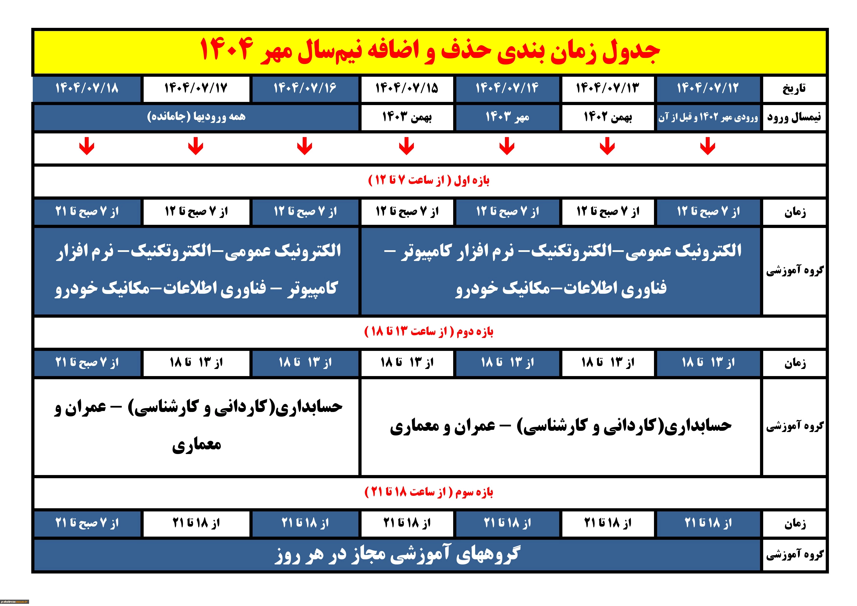 اطلاعیه حذف و اضافه نیمسال مهر 1404 جدول زمان بندی حذف و اضافه ‹ › اطلاعیه حذف و اضافه نیمسال مهر 1404 اطلاعیه حذف و اضافه نیمسال مهر 1404